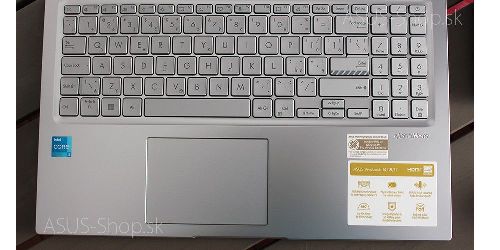 ASUS sa snaží vylepšovať notebooky po každej stránke. Po covidovej pandémii sa do popredia dostávajú témy zdravia. Preto aj tento model Vivobook 15 dostal antibakteriálnu povrchovú úpravu nabitými iónmi striebra na častiach, ktoré prichádzajú do kontaktu najčastejšie a mala by vydržať niekoľko rokov.{}{}
