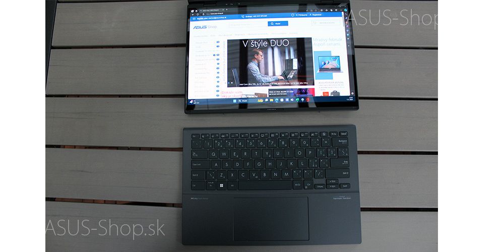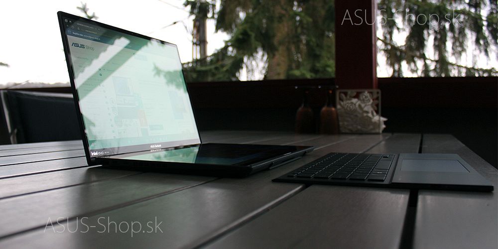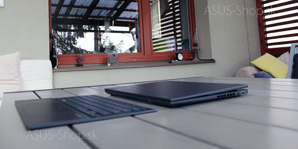 Poďme si predstaviť tento skvost bližšie. Po otvorení krabice máme v rukách Zenbook 14 typických rozmerov, trocha hrubší. Po otvorení horného displeja máme pred sebou štandardný 14-palcový notebook, nič nenasvedčuje iným, skrytým vlastnostiam. Ani používanie klávesnice a touchpadu nie je odlišné, nič sa neprehýba, neposúva, všetko funguje ako má. Až bližší pohľad odkrýva možnosť vybratia klávesnice zo špeciálnych priehlbín v kombinácii so silnými magnetmi. Už len vyberanie a vkladanie klávesnice je doslova fascinujúce a tak dokonale vymyslené. Klávesnica má na spodnej strane špeciálny mikrotextilný povrch zamedzujúci poškriabaniu spodného displeja, v prednej časti {}dotykové konektorové rozhranie pre nabíjanie. Samotná klávesnica funguje cez bluetooth rozhranie, ktoré je nutné zapnúť na ľavej strane umiestneným šupátkovým vypínačom.